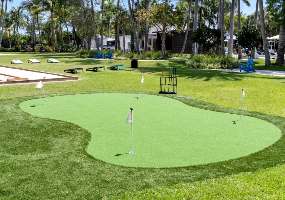 Dip, putt, repeat. Our mini golf hole sits between both pools—perfect for a quick round between swims.